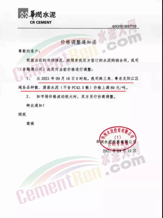 華潤水泥通知,根據(jù)當前的市場情況,公司(含越德公司)從2021年9月16日0時起,珠三角、粵東及陽江區(qū)域各品種散、袋裝水泥(不含PC42.5散)價格上調 80元/噸。