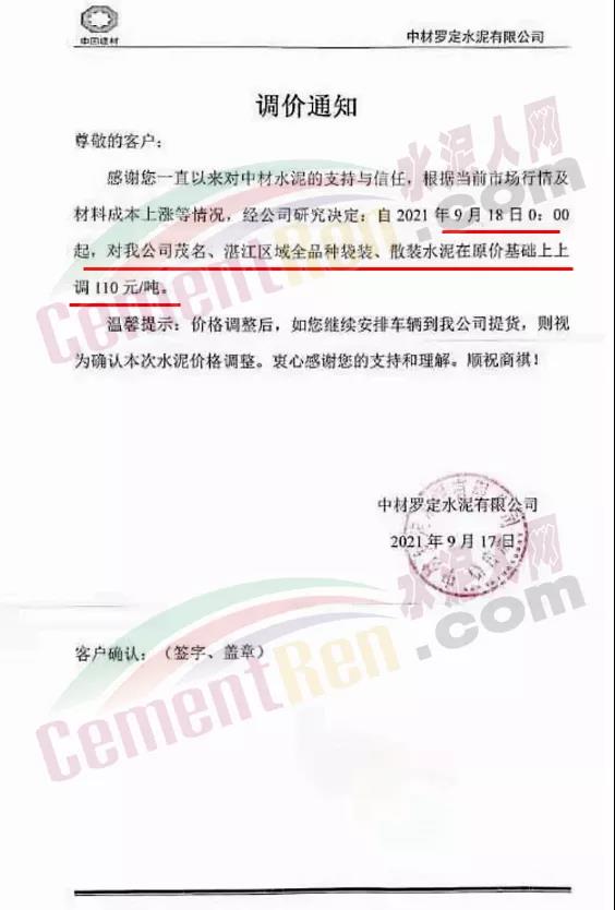 中材羅定水泥有限公司通知,自9月18日0時起,公司茂名、湛江區(qū)域全品種水泥上調110元/噸。