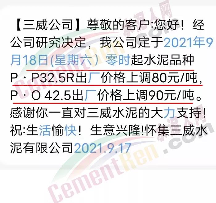 懷集三威水泥通知,9月18日零時起P.P32.5R水泥出廠價上調80元/噸,P.O42.5水泥出廠價格上調90元/噸。