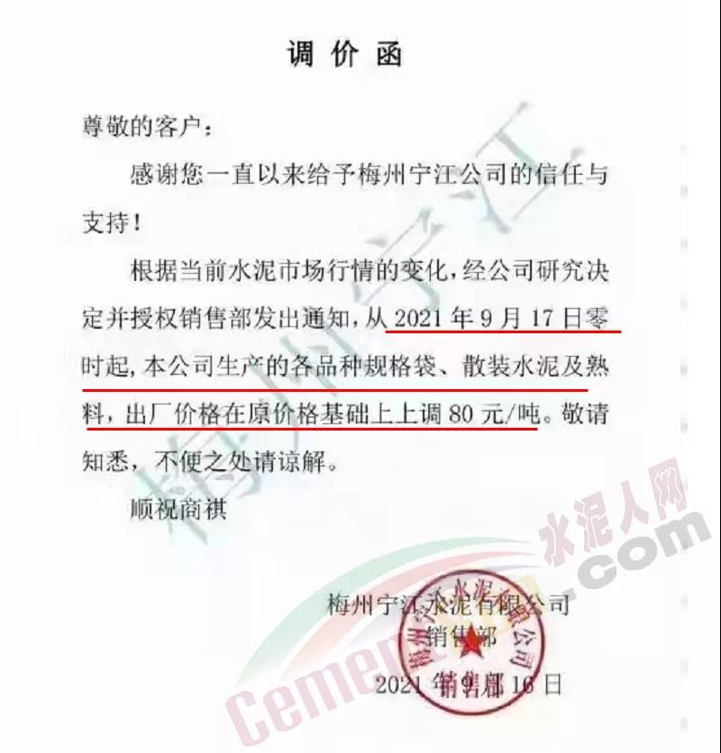 梅州寧江水泥通知自9月17日零時起,水泥價格上調80元/噸。
