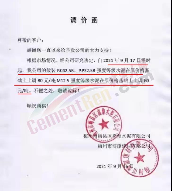 根據(jù)當前市場行情,我司決定自2021年9月18日零時起,上調三明區(qū)域各品種袋、散水泥價格80元/噸。特此通知!