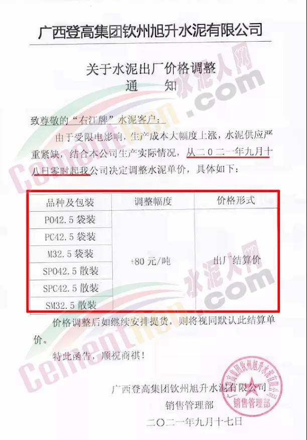 廣西登高集團欽州旭升水泥有限公司通知,自9月18日零,上 調公司各標號水泥價格80元/噸。