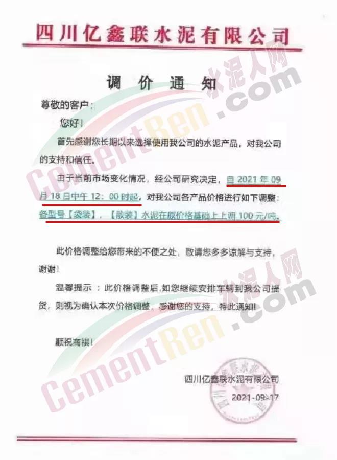 四川億鑫聯(lián)水泥通知,9月18日中午12時起,各標號水泥上調100元/噸。