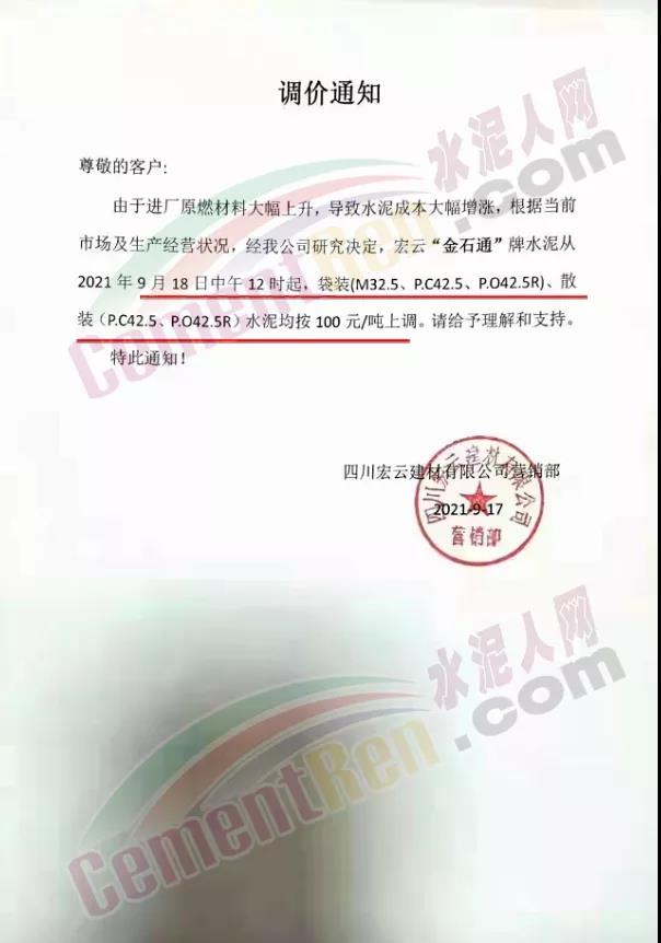 四川宏云建材有限公司通知,自9月18日中午12時起各標號水泥上調100元/噸。