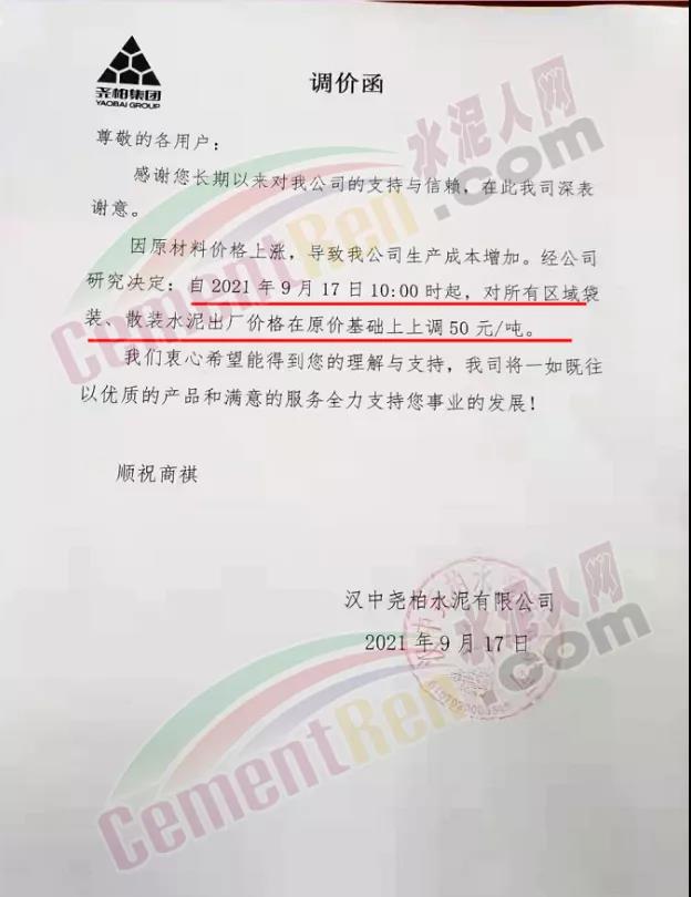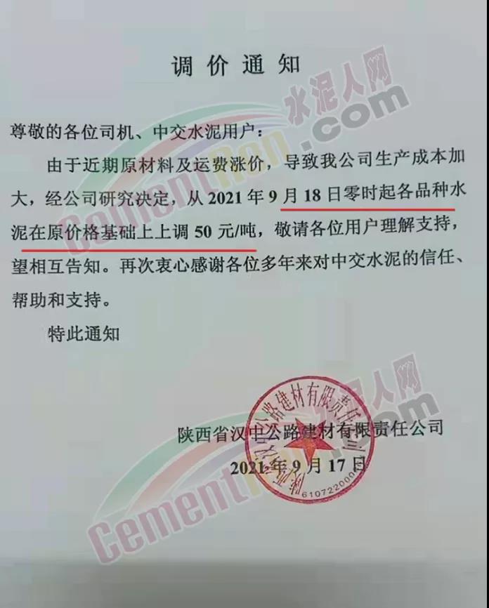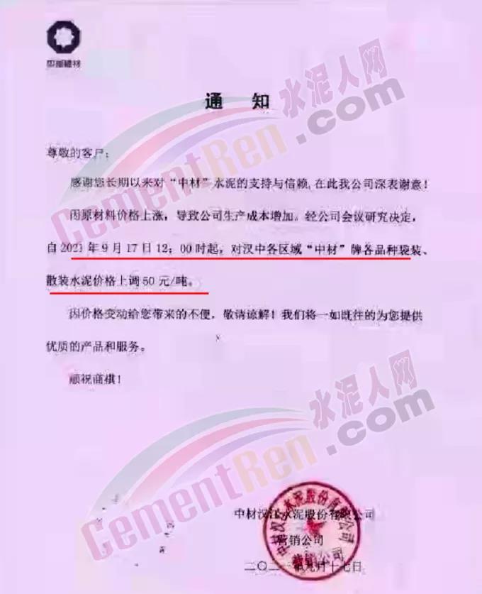 中材漢江水泥通知,自9月17日12時起對漢中各區(qū)域“中材”牌各品種水泥上調50元/噸。