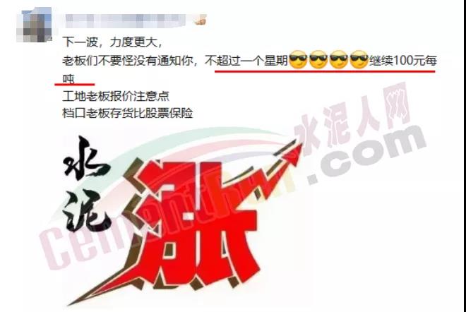 水泥銷售提示說:下一波,力度更大,老板們不要怪沒有通知你,不超過一個星期,繼續(xù)漲100元/噸。工地老板報價注意點,檔口老板存貨比買股票保險。