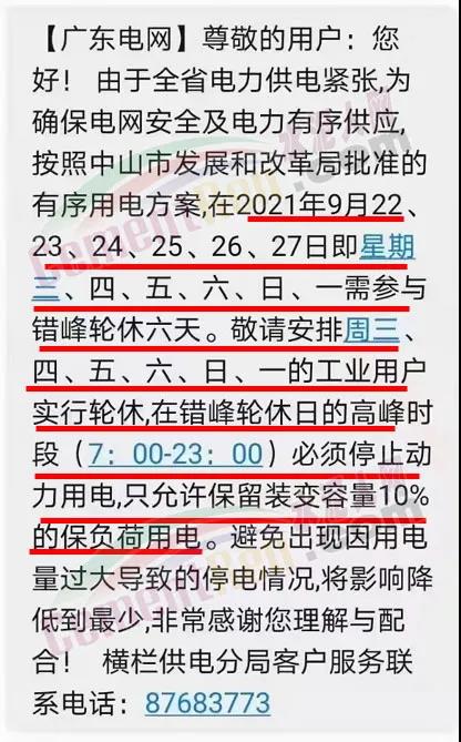 同日,廣東電網(wǎng)中山區(qū)域橫欄供電分局稱,由于全省電力供電緊張,為確保電網(wǎng)安全及電力有序供應(yīng),按照中山市發(fā)改委批準(zhǔn)的有序用電方案,在9月22日至27日七日內(nèi)除周二外參與錯峰輪休6天,在錯峰輪休日的7點(diǎn)至23點(diǎn)停止動力用電,只允許保留裝變?nèi)萘?0%的保負(fù)荷用電。
