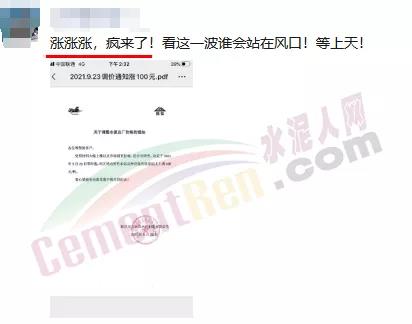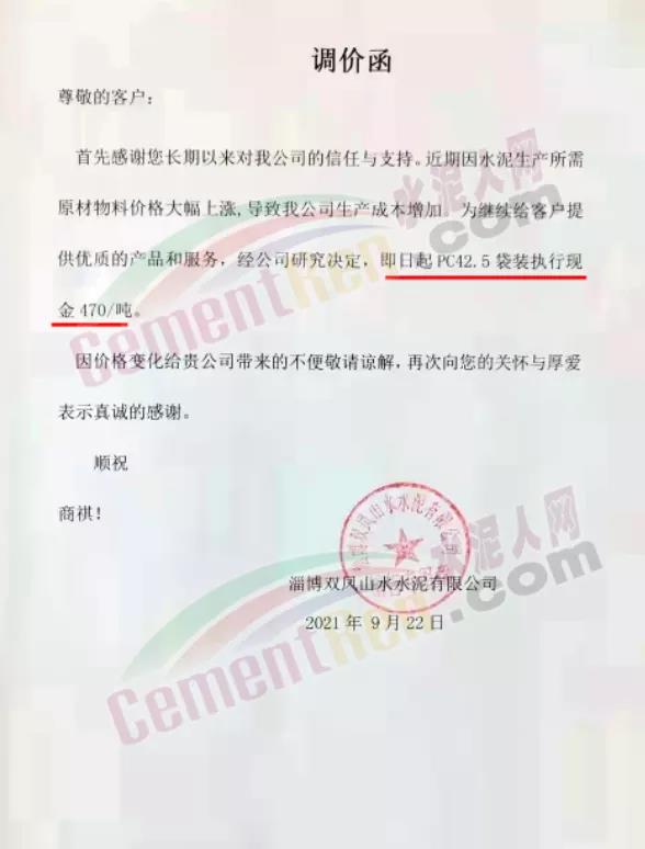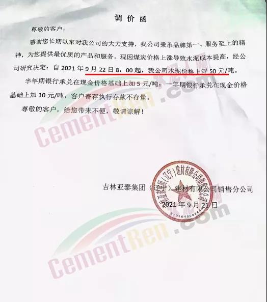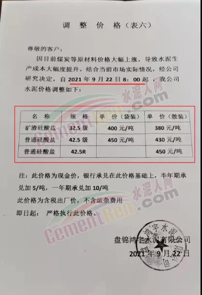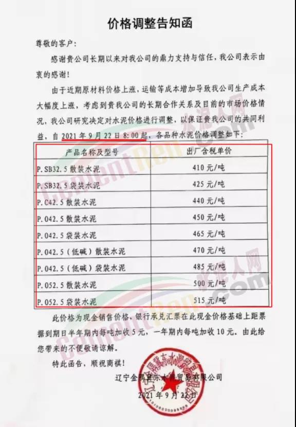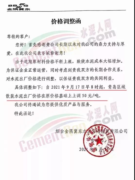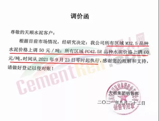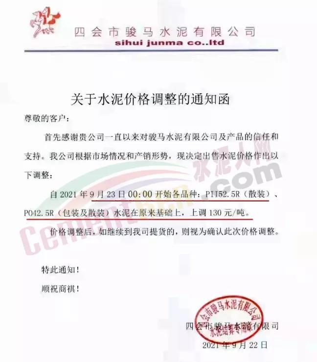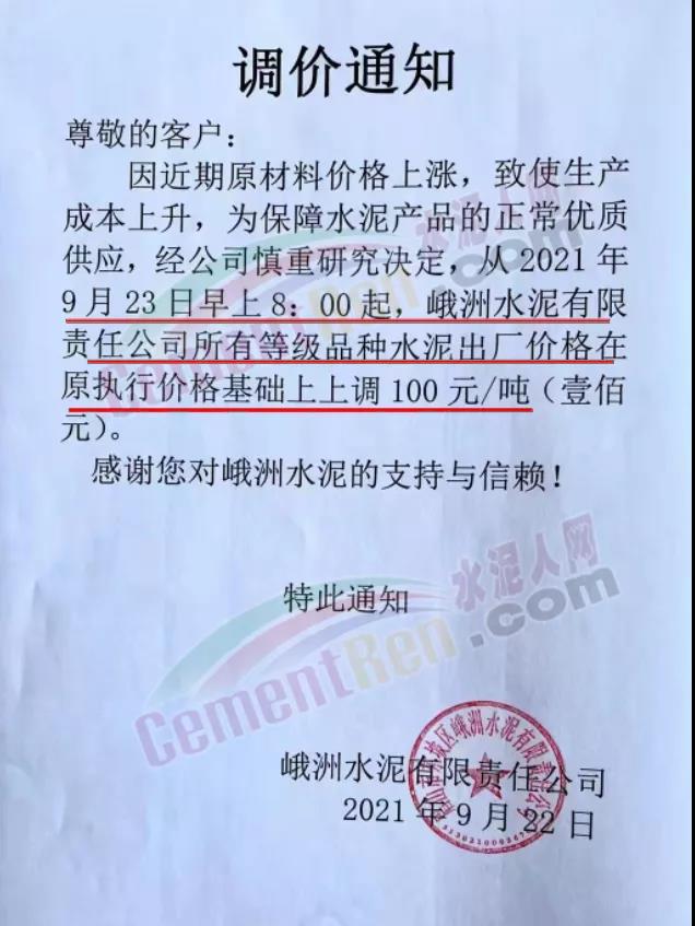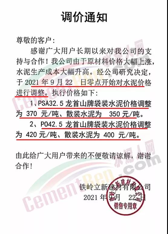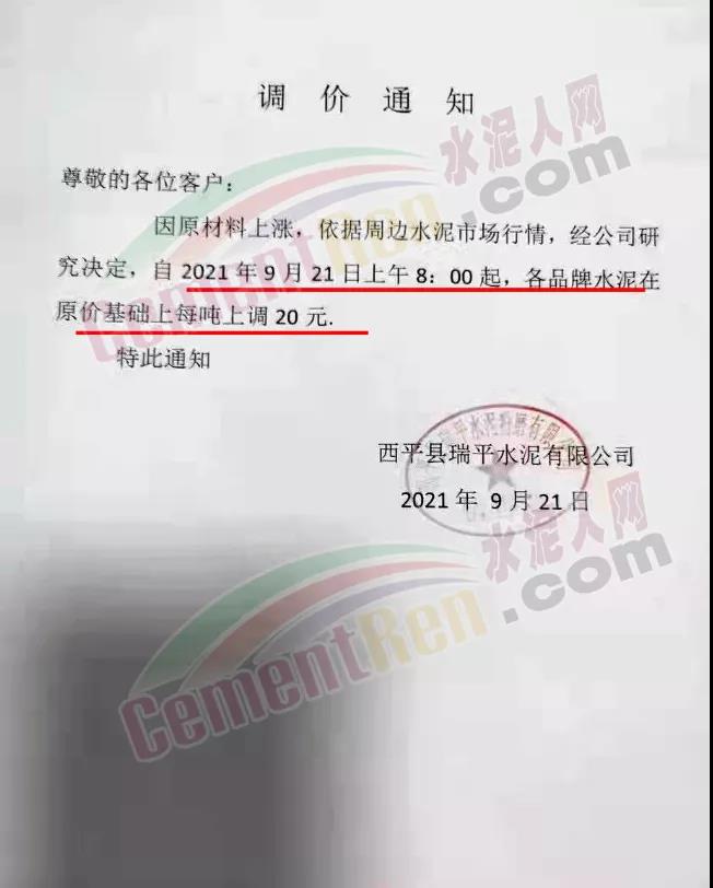 河南省駐馬店市平縣瑞平水泥有限公司通知因原材料上漲,依據(jù)周邊水泥市場行情,經(jīng)公司研究決定,自2021年9月21日上午8時起,各品牌水泥在原價基礎(chǔ)上上調(diào)20元/噸。