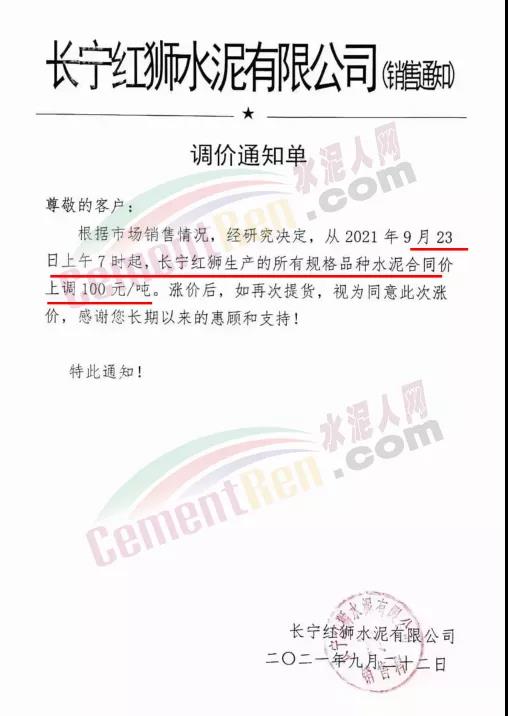 長寧紅獅水泥通知自9月23日上午7時起,所有品種水泥合同價上調(diào)100元/噸。