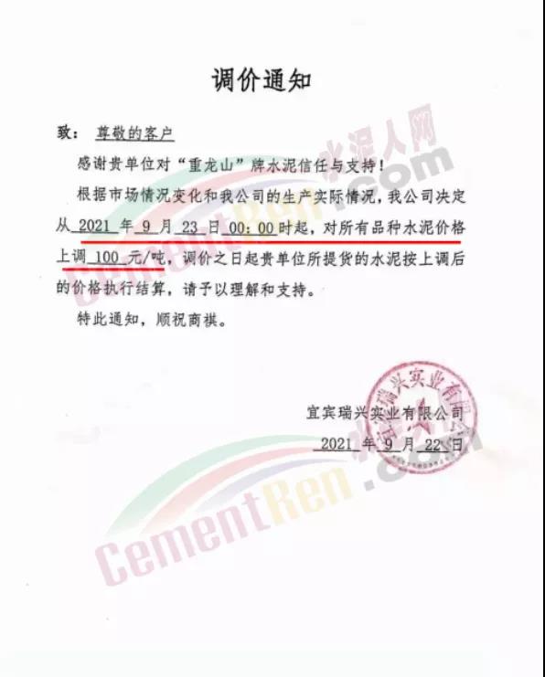 宜賓瑞興實(shí)業(yè)有限公司通知,9月23日0時起,所有品種水泥價格上調(diào)100元/噸。