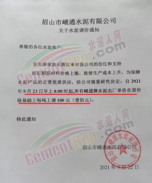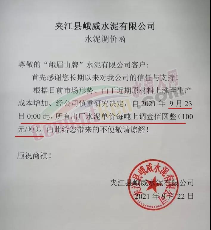 四川省樂山市夾江縣峨威水泥有限公司通知根據(jù)目前市場形勢、由于近期原材料上漲至生產(chǎn)成本增加、經(jīng)公司慎重研究決定,自2021年9月23日0時起,所有出廠水泥單價每噸上調(diào)100元/噸。