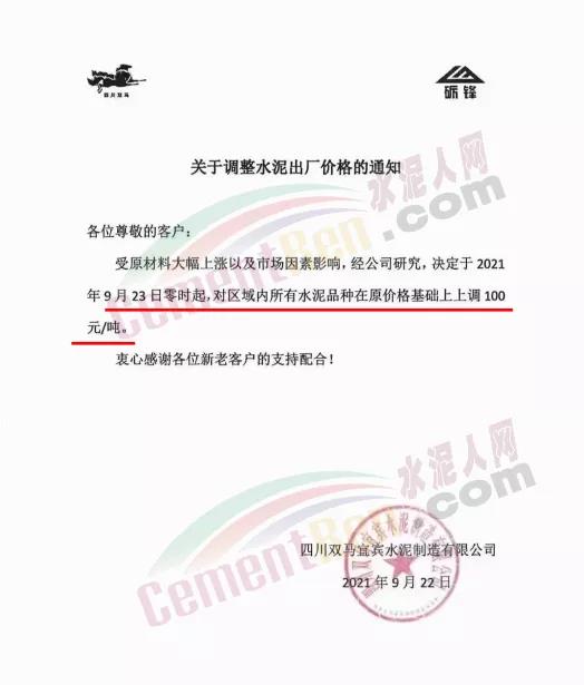雙馬宜賓水泥通知,9月23日零時起,水泥價格上調(diào)100元/噸。