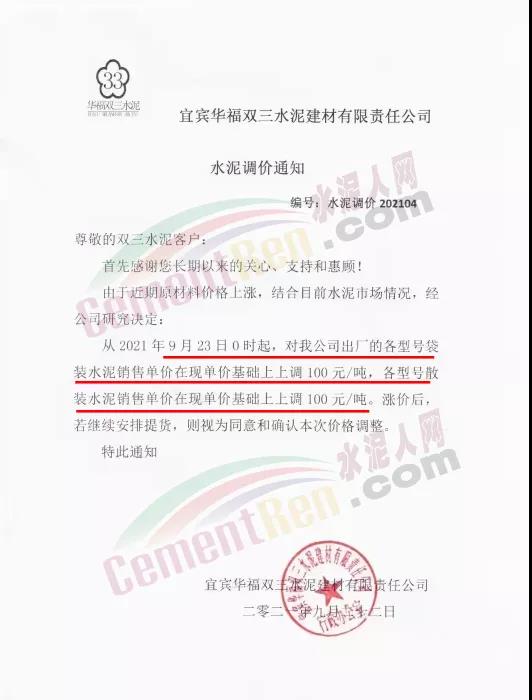 宜賓華福雙三水泥建材有限公司通知9月23日0時起,水泥價格上調(diào)100元/噸。