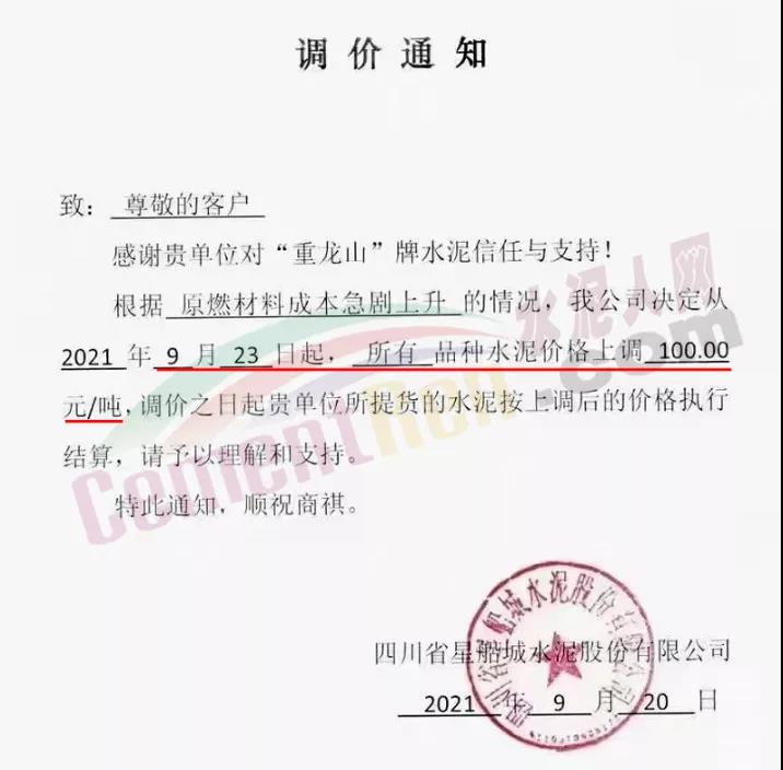 四川省星船城水泥股份有限公司通知根據(jù)原燃材料成本急劇上升的情況,公司決定從2021年9月23日起,所有品種水泥價格上調(diào)100元/噸。