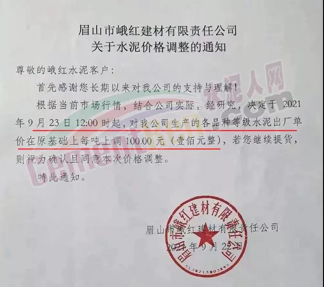 眉山市峨紅建材有限責(zé)任公司通知根據(jù)當(dāng)前市場行情,結(jié)合公司實(shí)際,經(jīng)研究,決定于2021 年9月23日12時起,對公司生產(chǎn)的各品種等級水泥出廠單價在原基礎(chǔ)上每噸上調(diào)100元/噸。