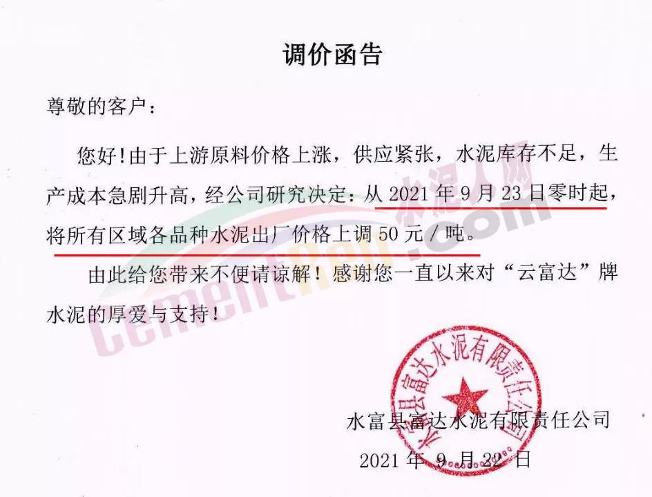云南省昭通市水富縣富達(dá)水泥有限責(zé)任公司通知由于上游原料價格上漲,供應(yīng)緊張,水泥庫存不足,生產(chǎn)成本急劇升高,經(jīng)公司研究決定從2021年9月23日零時起,將所有區(qū)域各品種水泥出廠價格上調(diào)50元/噸。
