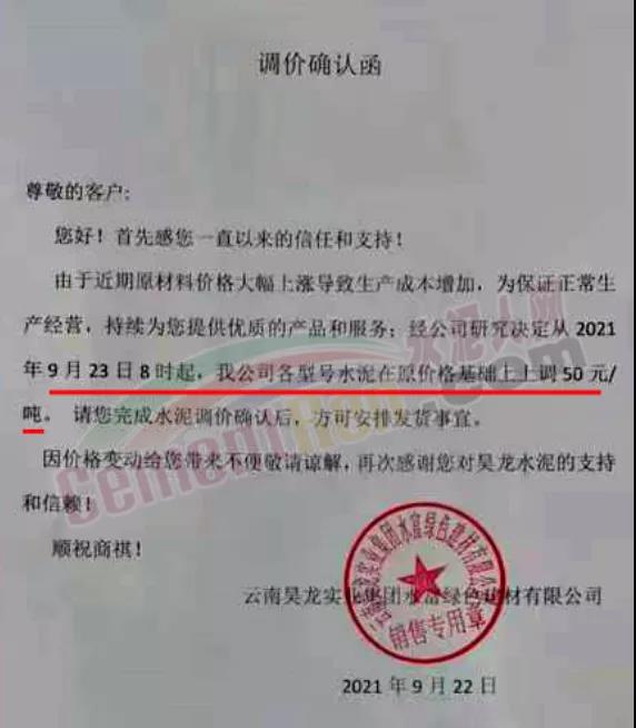 云南昊龍實(shí)業(yè)集團(tuán)水富綠色建材有限公司通知,由于近期愿材料價格大幅上漲導(dǎo)致生產(chǎn)成本增加,為保證正常生產(chǎn)經(jīng)營,經(jīng)公司研究決定從2021年9月23日8時起,各型號水泥在原價格基礎(chǔ)上上調(diào)50元/噸。