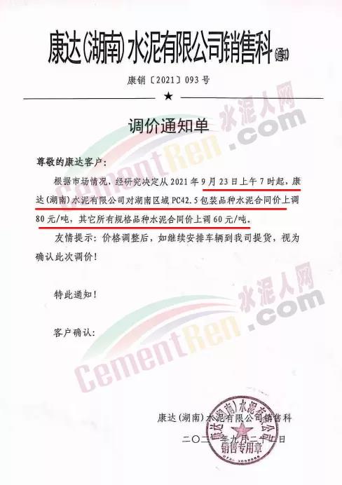 康達(dá)(湖南)水泥有限公司銷售科通知,根據(jù)市場情況,經(jīng)研究決定從2021年9月23日上午7時起,康達(dá)(湖南)水泥有限公司對湖南區(qū)域PC42.5包裝品種水泥合同價上調(diào)80元/噸,其它所有規(guī)格品種水泥合同價上調(diào)60元/噸。