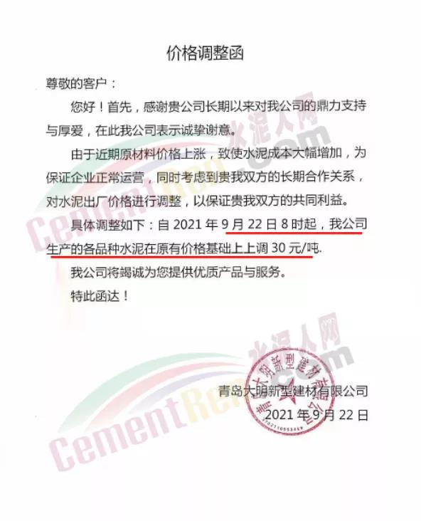 青島大明新型建材有限公司通知由于近期原材料價格上漲,致使水泥成本大幅增加,為保證企業(yè)正常運(yùn)營,自2021年9月22日8時起,公司生產(chǎn)的各品種水泥在原有價格基礎(chǔ)上上調(diào)30元/噸。