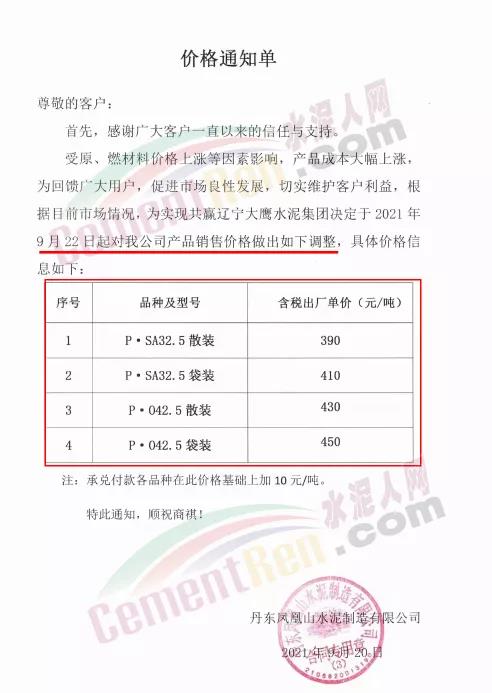 丹東鳳凰山水泥通知,自9月22日起調(diào)整水泥價格,P.O42.5散裝水泥調(diào)整為430元/噸,承兌付款在此價格基礎(chǔ)上加10元/噸。