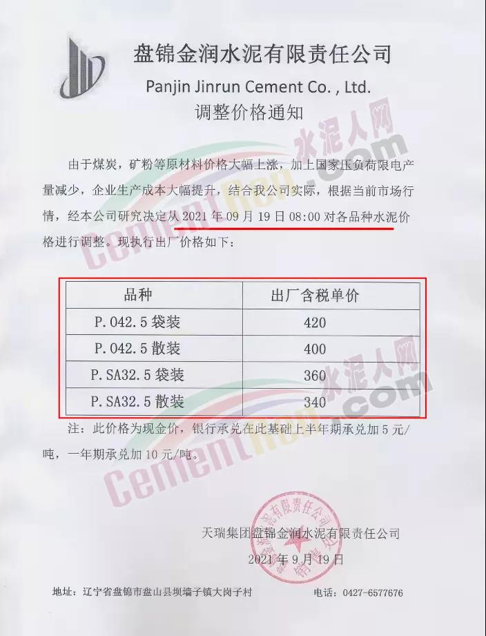 盤錦金潤水泥通知,9月19日起調(diào)整水泥價格,PO42.5散裝水泥報價400元/噸。