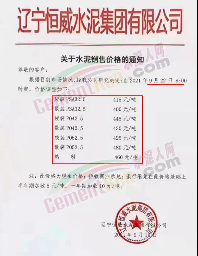 遼寧恒威水泥通知,9月22日8時起上調(diào)各標(biāo)號水泥價格,P.O42.5散裝水泥報價430元/噸。
