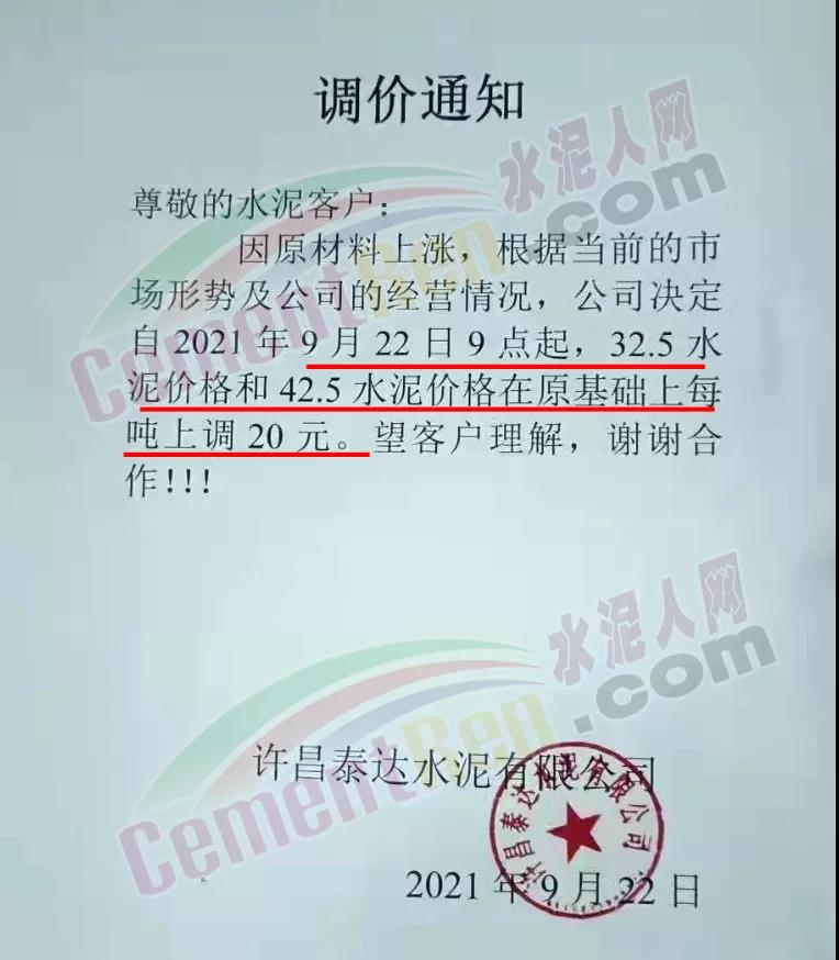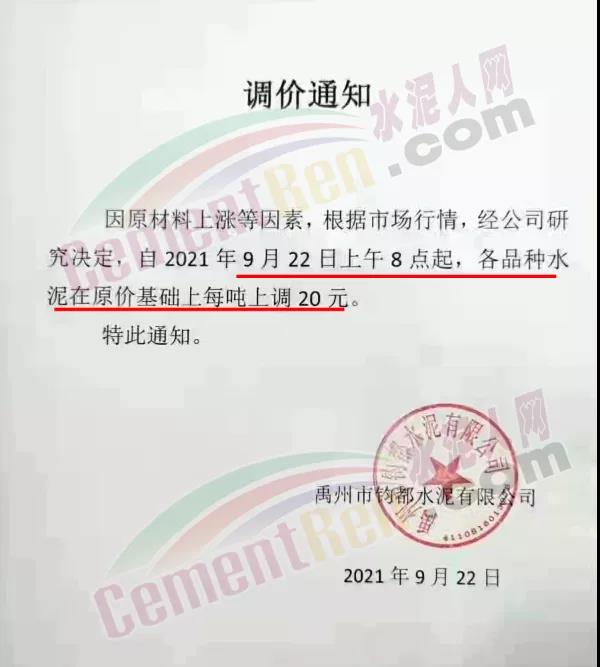 禹州市鈞都水泥有限公司通知因原材料上漲等因素,根據(jù)市場行情,經(jīng)公司研究決定,自2021年9月22日上午8點(diǎn)起,各品種水泥在原價基礎(chǔ)上每噸上調(diào)20元。