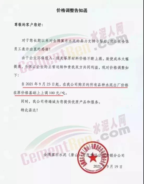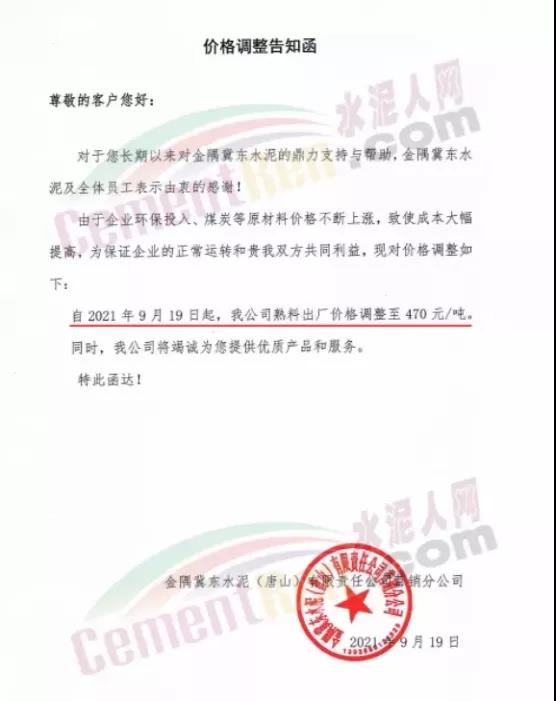 金隅冀東水泥(唐山)有限責(zé)任公司自2021年9月23日起所有品種水泥出廠價格在原價格基礎(chǔ)上上調(diào)100元/噸;熟料出廠價調(diào)整至470元/噸。