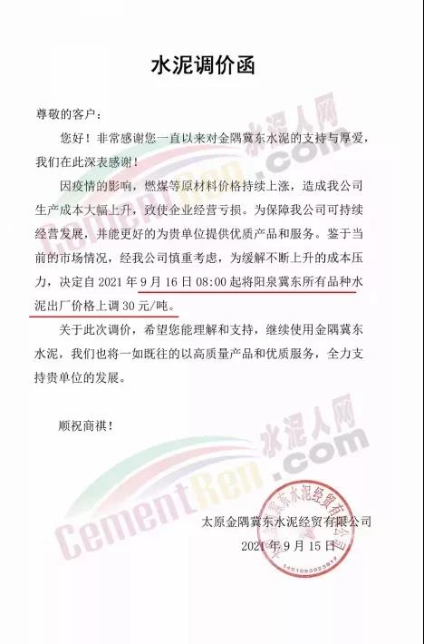 山西太原金隅冀東水泥經(jīng)貿(mào)有限公司通知,因疫情的影響,燃煤等原材料價格持續(xù)上漲,造成公司生產(chǎn)成本大幅上升,致使企業(yè)經(jīng)營虧損。為保障公司可持續(xù)經(jīng)營發(fā)展,并能更好的為貴單位提供優(yōu)質(zhì)產(chǎn)品和服務(wù)。鑒于當(dāng)前的市場情況,經(jīng)公司慎重考慮,為緩解不斷上升的成本壓力,決定自2021年9月16日08∶00起將陽泉冀東所有品種水泥出廠價格上調(diào)30元/噸。