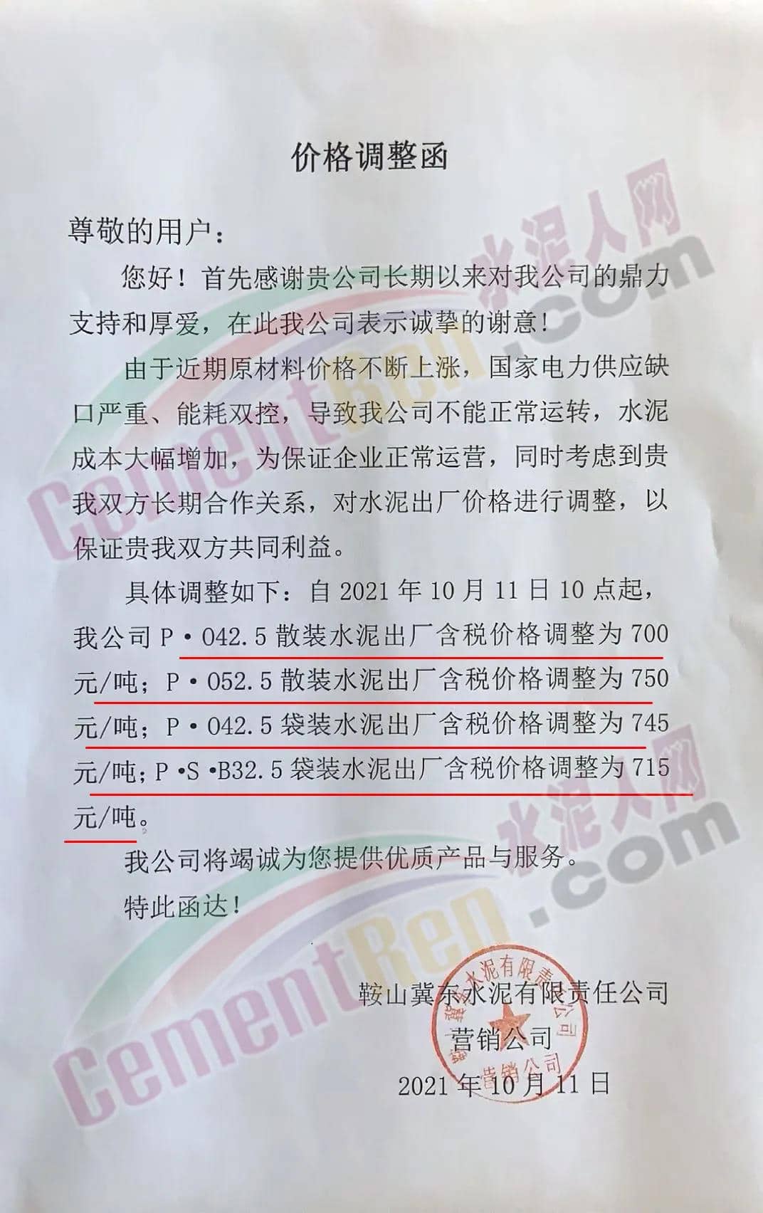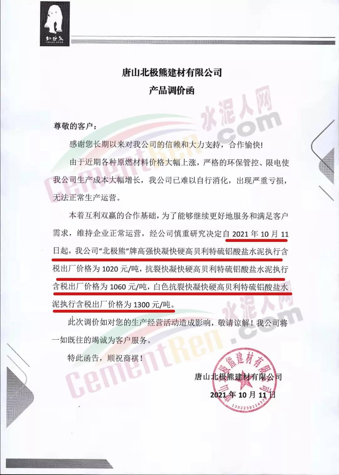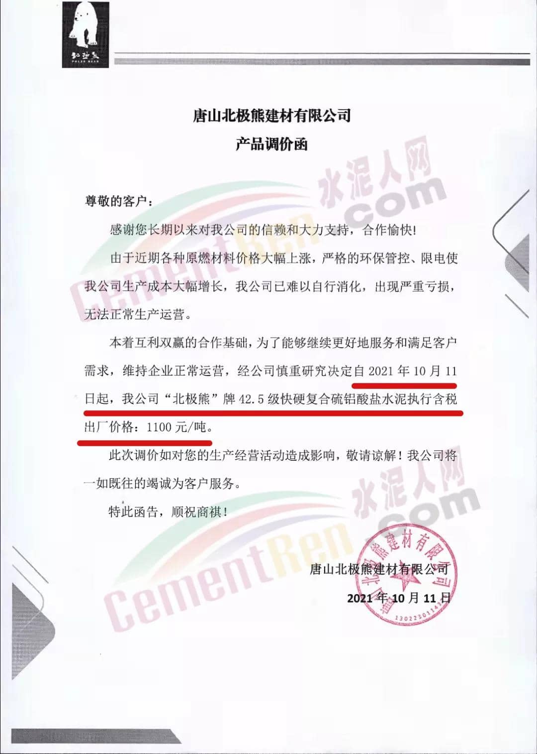 10月11日唐山北極熊建材有限公司發(fā)布通知稱:本著互利雙贏的合作基礎(chǔ),為了能夠繼續(xù)更好地服務(wù)和滿足客戶需求,維持企業(yè)正常運(yùn)營,經(jīng)公司慎重研究決定自2021年10月11日起,調(diào)整產(chǎn)品價(jià)格。調(diào)價(jià)后旗下“北極熊”品牌水泥價(jià)格最高達(dá)1300元/噸。