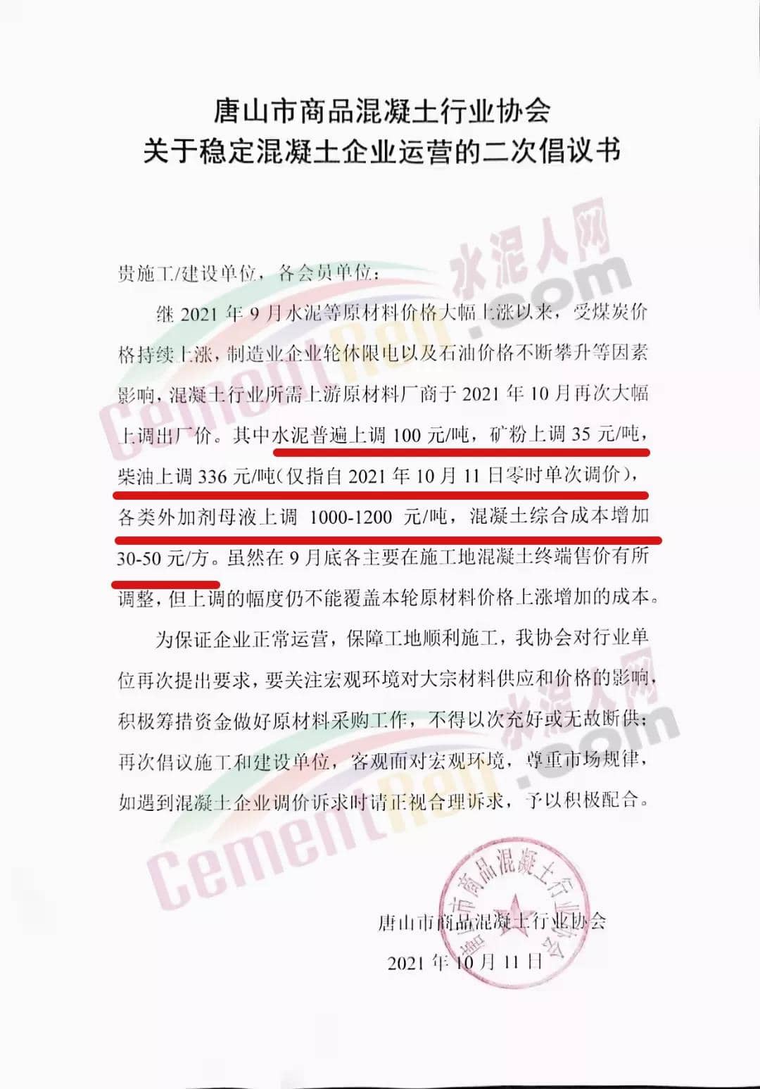 同日,唐山市商品混凝土行業(yè)協(xié)會(huì)發(fā)布《關(guān)于穩(wěn)定混凝土企業(yè)運(yùn)營的二次倡議書》給各施工/建設(shè)單位及會(huì)員單位稱,繼2021年9月水泥等原材料價(jià)格大幅上漲以來,受煤炭價(jià)格持續(xù)上漲,制造業(yè)企業(yè)輪休限電以及石油價(jià)格不斷攀升等因素影響,混凝土行業(yè)所需上游原材料廠商于2021年10月再次大幅上調(diào)出廠價(jià)。其中水泥普遍上調(diào)100元/噸,礦粉上調(diào)35元/噸,柴油上調(diào)336元/噸(僅指自2021年10月11日零時(shí)單次調(diào)價(jià)),各類外加劑母液上調(diào)1000-1200元/噸,混凝土綜合成本增加30-50元/方。雖然在9月底各主要在施工地混凝土終端售價(jià)有所調(diào)整,但上調(diào)的幅度仍不能覆蓋本輪原材料價(jià)格上漲增加的成本。