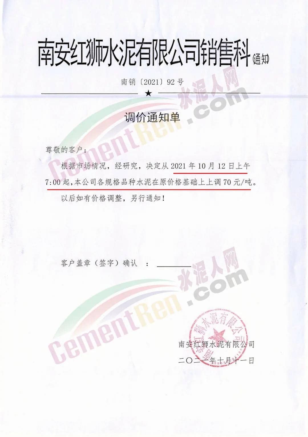 福建泉州南安紅師水泥有限公司銷售科通知,根據(jù)市場情況,經(jīng)研究決定從2021年10月12日上午7時(shí)起,各規(guī)格品種水泥在原價(jià)格基礎(chǔ)上上調(diào)70元/噸。