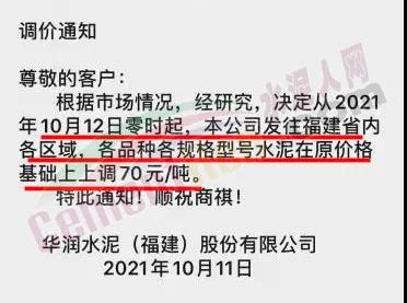 華潤水泥(福建)股份有限公司通知根據(jù)市場情況,經(jīng)研究決定從2021年10月12日零時(shí)起,發(fā)往福建省內(nèi)各區(qū)域,各品種各規(guī)格型號水泥在原價(jià)格基礎(chǔ)上上調(diào)70元/噸。