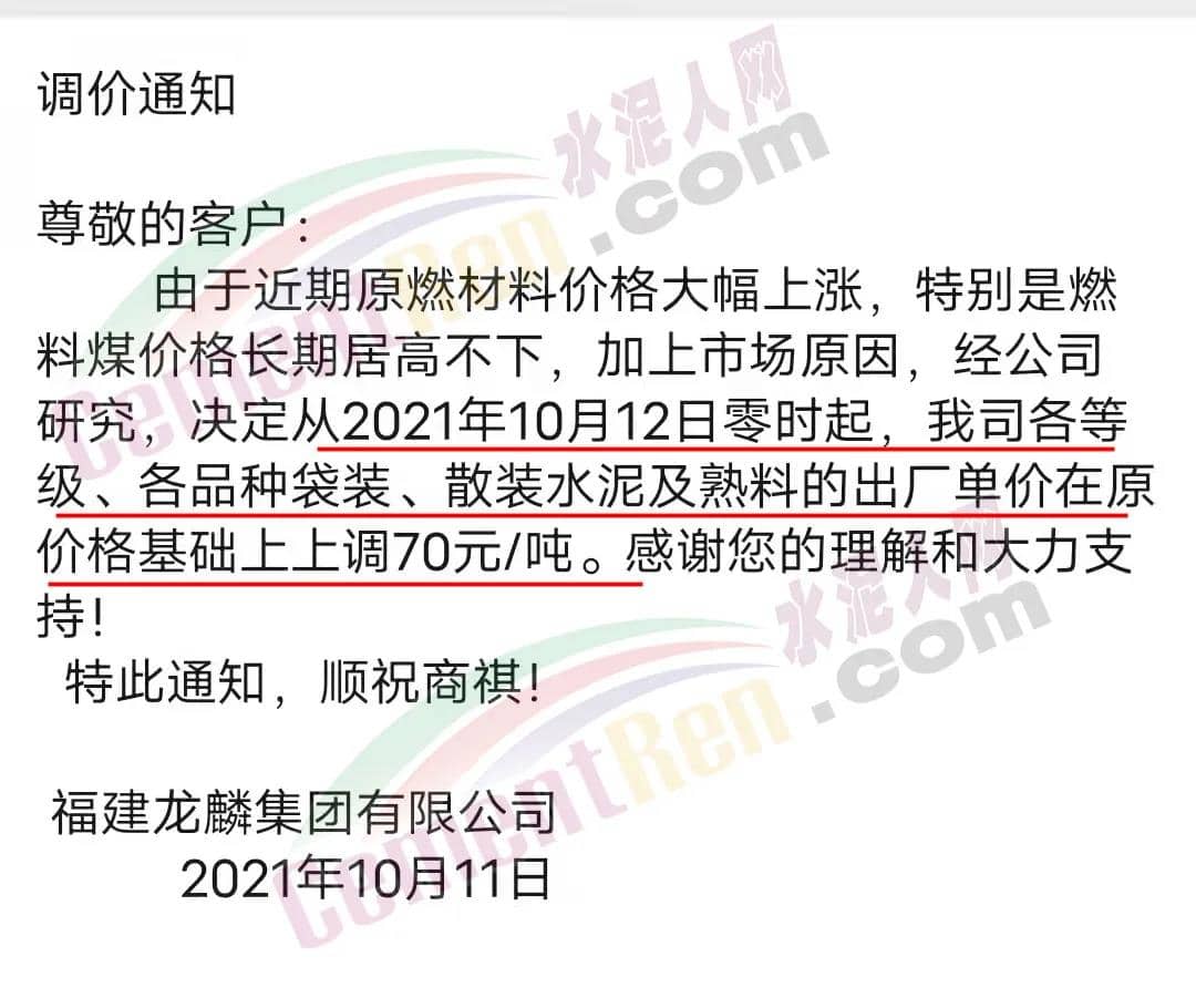 福建龍麟集團(tuán)有限公司通知,由于近期原燃材料價(jià)格大幅上漲,特別是燃料煤價(jià)格長期居高不下,加上市場原因,經(jīng)公司研究,決定從2021年10月12日零時(shí)起,公司各等級、各品種袋裝、散裝水泥及熟料的出廠單價(jià)在原價(jià)格基礎(chǔ)上上調(diào)70元/噸。