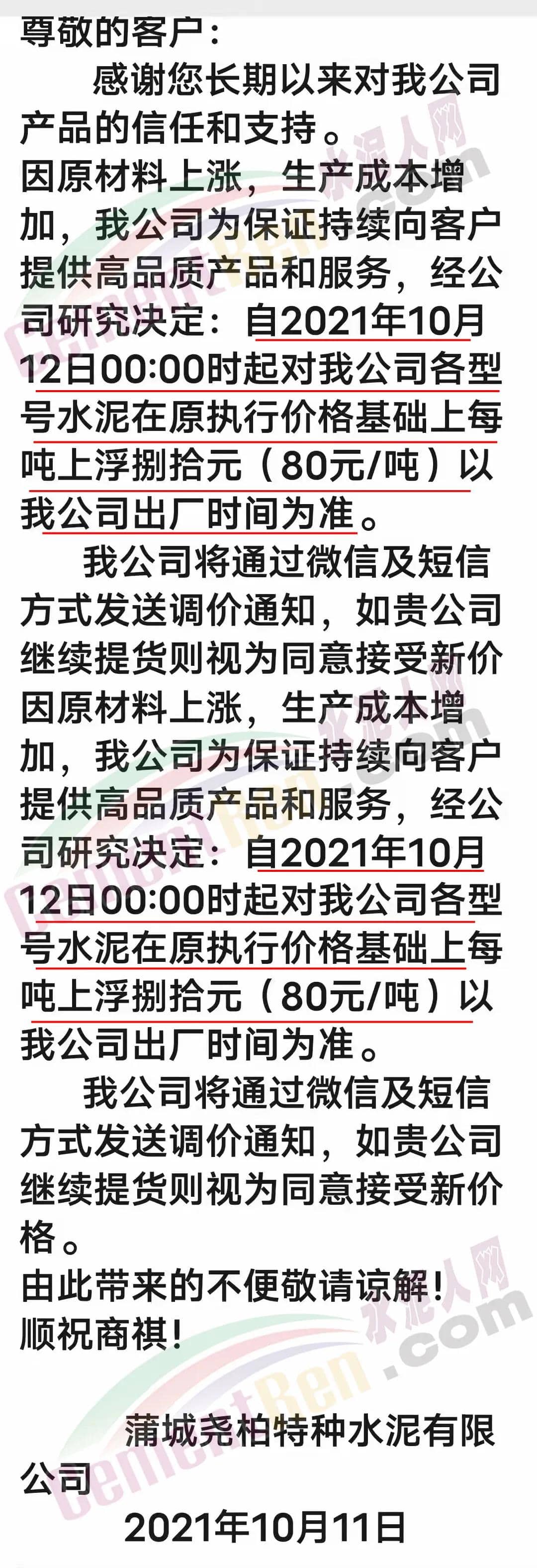 蒲城堯柏特種水泥有限公司通知,因原材料上漲,生產(chǎn)成本增加,公司為保證持續(xù)向客戶提供高品質(zhì)產(chǎn)品和服務(wù),經(jīng)公司研究決定,自2021年10月12日0時(shí)起對公司各型號水泥在原執(zhí)行價(jià)格基礎(chǔ)上上浮80元/噸。