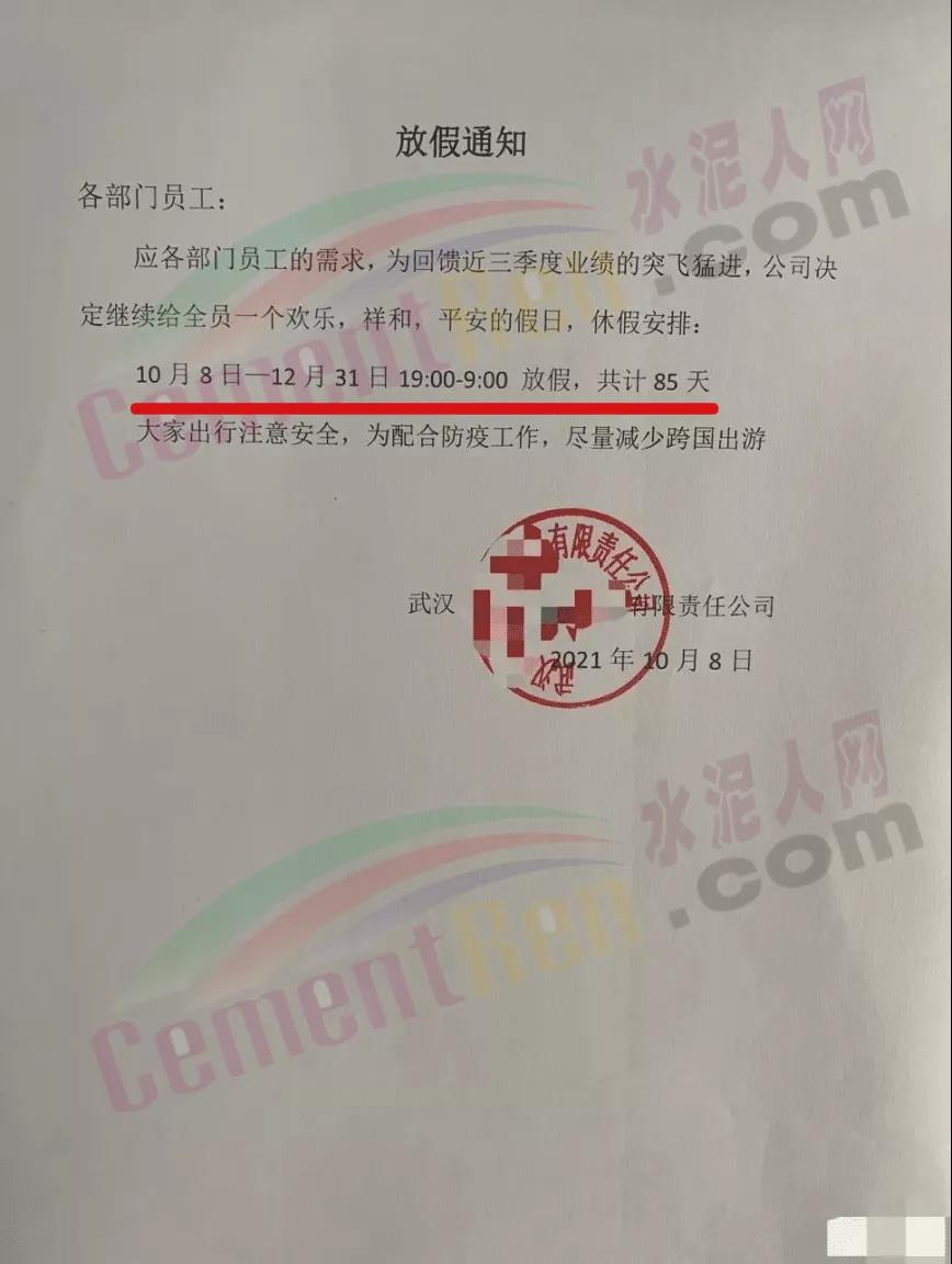 近日,湖北武漢某企業(yè)發(fā)布放假通知,稱應(yīng)各部門(mén)員工的需求,為回饋近三季度業(yè)績(jī)的突飛猛進(jìn),決定繼續(xù)給全員一個(gè)歡樂(lè),祥和,平安的假日,休假安排:10月8日一12月31日19:00-9:00放假,共計(jì)85天。