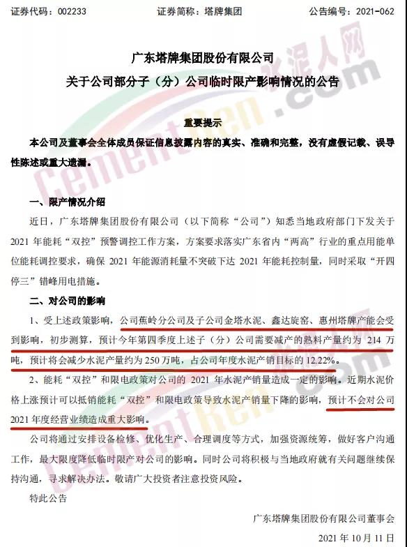 10月11日塔牌集團(tuán)稱,近日,廣東塔牌集團(tuán)股份有限公司知悉當(dāng)?shù)卣块T(mén)下發(fā)關(guān)于2021 年能耗“雙控”預(yù)警調(diào)控工作方案,方案要求落實(shí)廣東省內(nèi)“兩高”行業(yè)的重點(diǎn)用能單位能耗調(diào)控要求,確保2021年能源消耗量不突破下達(dá)2021年能耗控制量,同時(shí)采取“開(kāi)四停三”錯(cuò)峰用電措施。
