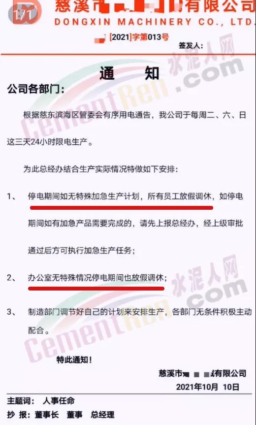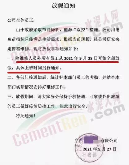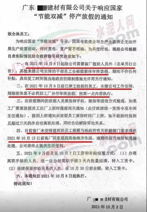 同日,遼寧省遼陽(yáng)市工信局發(fā)布通知要求自2021年10月9日8時(shí)起,對(duì)水泥行業(yè)8戶熟料企業(yè)、11條熟料生產(chǎn)實(shí)施有序用電措施,期間水泥熟料生產(chǎn)停止用電,有序用電時(shí)間預(yù)計(jì)不低于15天,結(jié)束時(shí)間另行通知。同時(shí)要求對(duì)擅自啟動(dòng)水泥熟料生產(chǎn)用電的企業(yè),要責(zé)令改正,情節(jié)嚴(yán)重的停止供電。