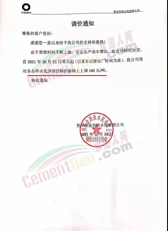 貴州織金西南水泥有限公司通知由于原燃材料不斷上漲,企業(yè)生產(chǎn)成本增加,經(jīng)公司研究決定,自2021年10月21日零點(diǎn)起(以重車過磅出廠時(shí)間為準(zhǔn)),公司各品種水泥上調(diào)180元/噸。?