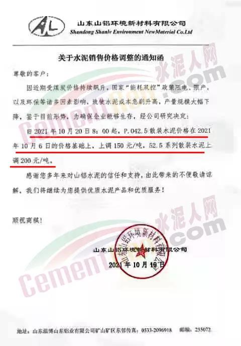 山東山鋁環(huán)境新材料有限公司通知,因近期受煤炭?jī)r(jià)格持續(xù)飆升,國(guó)家"能耗雙控"政策限電、限產(chǎn)以及環(huán)保等諸多因素影響,致使水泥成本急劇升高,產(chǎn)量規(guī)模大幅下降、鑒于目前形勢(shì),為確保企業(yè)能夠生存,經(jīng)公司研究決定,自2021年10月20日8時(shí)起,P.042.5散裝水泥價(jià)格在2021年10月6日的價(jià)格基礎(chǔ)上,上調(diào)150元/噸,52.5系列散裝水泥上調(diào)200元/噸。