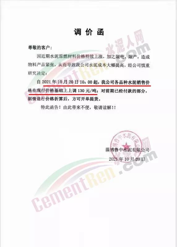 淄博錦川水泥有限公司通知,近期由于限電、錯(cuò)峰生產(chǎn),影響水泥原材料持續(xù)大幅上漲,根據(jù)目前水泥市場(chǎng)情況,經(jīng)公司研究決定,自2021年10月20日10時(shí)起,各種水泥型號(hào)在原價(jià)的基礎(chǔ)上,上漲20元/噸。