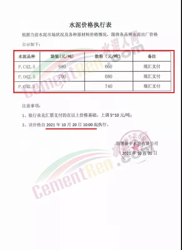 淄博魯中水泥有限公司通知,因近期水泥原燃材料價(jià)格持續(xù)上漲,加之限電、限產(chǎn),造成物料產(chǎn)品緊張,從而導(dǎo)致公司水泥成本大幅提高,經(jīng)公司慎重研究決定,自2021年10月20日10∶00起,公司各品種水泥銷售價(jià)格在現(xiàn)行價(jià)格基礎(chǔ)上上調(diào)130元/噸。對(duì)前期已經(jīng)付款的部分,據(jù)情進(jìn)行價(jià)格折算后,方可開單提貨。企業(yè)同期發(fā)布的水泥價(jià)格執(zhí)行表顯示,P.O42.5散裝水泥、P.C42.5袋裝水泥報(bào)價(jià)均為680元/噸。
