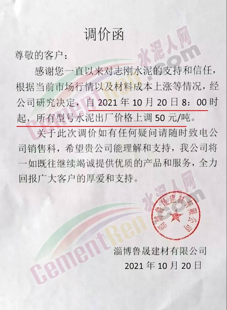 淄博魯晟建材有限公司通知,根據(jù)當(dāng)前市場(chǎng)行情以及材料成本上漲等情況,經(jīng)公司研究決定,自2021年10月20日8∶00時(shí)起,所有型號(hào)水泥出廠價(jià)格上調(diào)50元/噸。