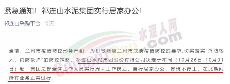日前,祁連山水泥集團(tuán)發(fā)緊急通知稱,當(dāng)前蘭州市疫情防控形勢嚴(yán)峻,為積極響應(yīng)蘭州市政府疫情防控的要求,切實(shí)落實(shí)“外防輸入,內(nèi)防反彈”的防控策略,祁連山水泥集團(tuán)股份有限公司決定于10月26日-10月31日起,集團(tuán)總部全體工作人員實(shí)行周末工作模式,自行居家辦公,停班不停工,在此期間所有業(yè)務(wù)正常進(jìn)行。
