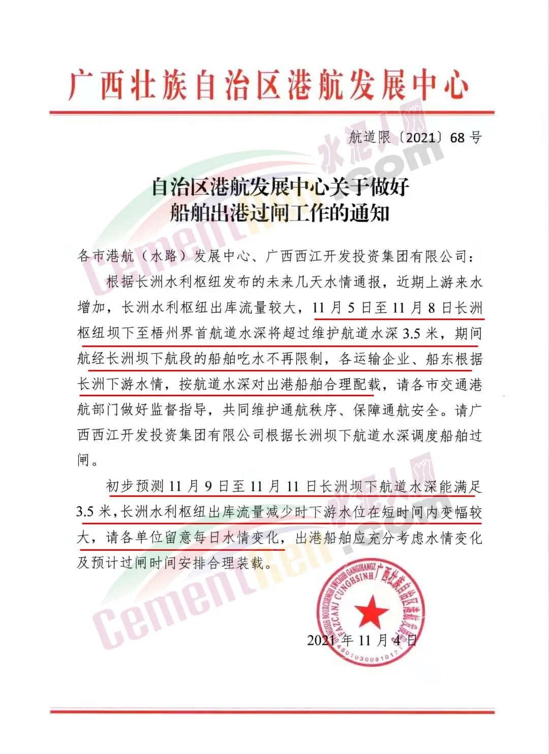 11月4日,廣西壯族自治區(qū)港航發(fā)展中心發(fā)布《自治區(qū)港航發(fā)展中心關(guān)于做好船舶出港過(guò)閘工作的通知》給各市港航(水路)發(fā)展中心、廣西西江開發(fā)投資集團(tuán)有限公司稱,根據(jù)長(zhǎng)洲水利樞紐發(fā)布的未來(lái)幾天水情通報(bào),近期上游來(lái)水增加,長(zhǎng)洲水利樞紐出庫(kù)流量較大,11月5日至11月8日長(zhǎng)洲樞紐壩下至梧州界首航道水深將超過(guò)維護(hù)航道水深3.5米,期間航經(jīng)長(zhǎng)洲壩下航段的船舶吃水不再限制,各運(yùn)輸企業(yè)、船東根據(jù)長(zhǎng)洲下游水情,按航道水深對(duì)出港船舶合理配載。