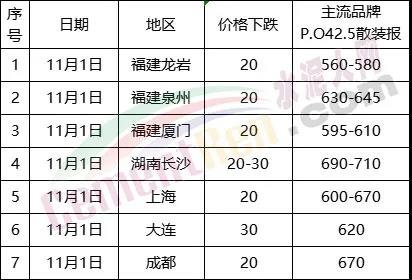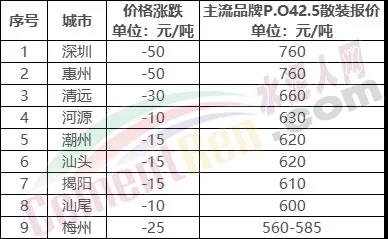 11月4日廣東省部分區(qū)域水泥價(jià)格漲跌一覽