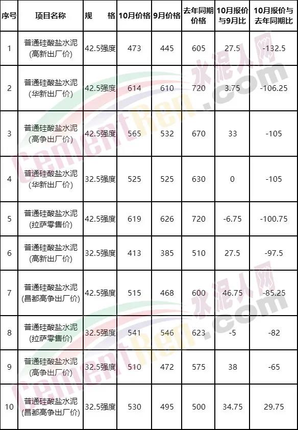 據(jù)10月末西藏發(fā)改委公布數(shù)據(jù),高新、華新、高爭(zhēng)等多家企業(yè)32.5和42.5強(qiáng)度水泥與去年同期相比出現(xiàn)不同程度的下跌。其中,普通硅酸鹽水泥出廠價(jià)10月份報(bào)價(jià)較去年同期下跌相對(duì)較大。其中42.5強(qiáng)度高新跌132.5元/噸,華新下跌106.25元/噸,高爭(zhēng)下跌105元/噸;32.5強(qiáng)度,華新下跌105元/噸;拉薩地區(qū)42.5強(qiáng)度零售價(jià)下跌100.75元/噸。