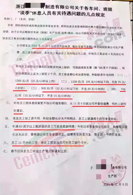近日,某制造企業(yè)發(fā)布通知稱:從2021年11月9日正式開始休息,暫時至春節(jié)放假。休息期間如果公司生產(chǎn)需要,員工接到通知后,本地員工務必在2天內到公司上班,外地員工務必在4天內回公司上班。