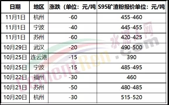 據(jù)水泥人網(wǎng)了解,受鋼價下調帶動,近日長江沿線及周邊區(qū)域S95礦渣粉報價跟降,相關數(shù)據(jù)顯示,自10月下旬以來,江蘇蘇州兩次下調礦渣粉價格,累計下調110元/噸;浙江杭州礦渣粉兩次下調報價,累計下調90元/噸,寧波兩次下調55元/噸。