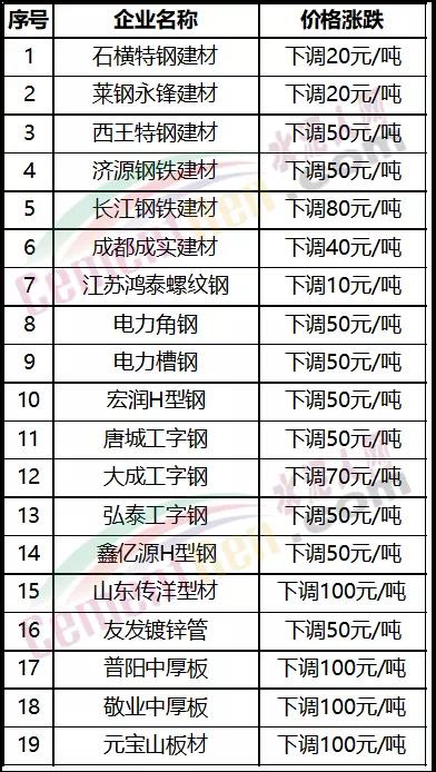 11月9日近20家鋼廠調價,其中下跌最大為山東傳洋型材,一次性下調報價100元/噸,具體調價明細如下: